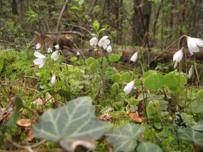 ...zusammen mit Moos, Efeu und Fichtensämling auf einem toten Baumstamm