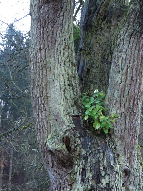 Epiphyten (Aufsitzerpflanzen) auch bei uns. Hier eine Taubnessel auf einem auf dem Foto nicht eindeutig zu bestimmenden Baum. Vielleicht eine Birne.