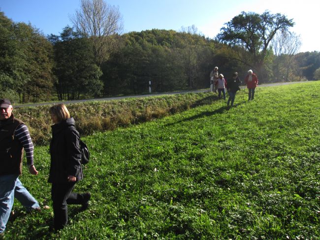 Nachdem wir eine Straße gequert haben, laufen wir über eine Wiese ...