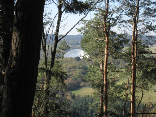 Nach der Mittagspause taucht das Radioteleskop Effelsberg kurz zwischen den Bäumen auf.